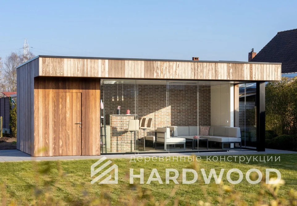 Лофт вырос из индустриальной эстетики: прямые линии, понятный каркас, фактура материалов на первом плане. В беседке это выражается в открытых балках, строгой геометрии, крупном остеклении и функциональности каждой детали. Никакой визуальной «тяжести» — только то, что работает на комфорт и стиль.